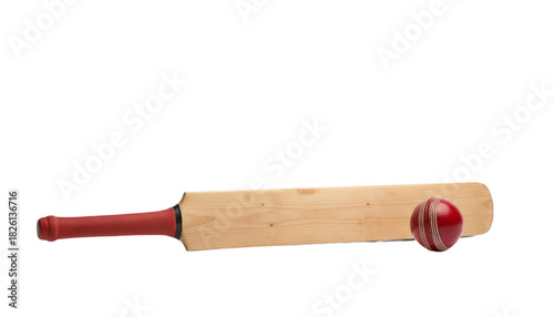 © komgritch, Fototapeta premium A cricket bat and ball set, showcasing the bat's wooden texture and the ball's bright red color and stitching, isolated on white background, transparent background.