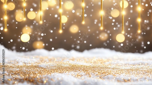Obraz premium A crisp winter background with snow-covered ground sparkling with gold glitter, while golden bokeh lights glow softly in the background.