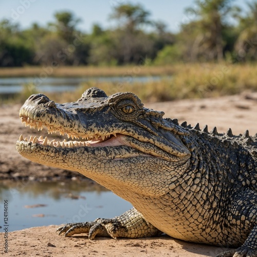 © Ismail, Obraz premium A crocodile basking in the sun, isolated on a white background.