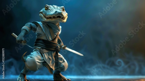 © Kerah, Fototapeta premium A crocodile child ninja with a black belt and shurikens, posing. dark blue background, dramatic view, copy space, 3d rendering --ar 16:9 Job ID: 89e0ff8b-4049-4927-9f87-71823d189d21