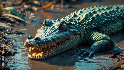 © Lasvu, Obraz premium A crocodile resting in muddy water with scales and sharp teeth. Wildlife and nature, animal photography. Reptiles and aquatic habitats. The concept of river ecosystems and wildlife conservation.