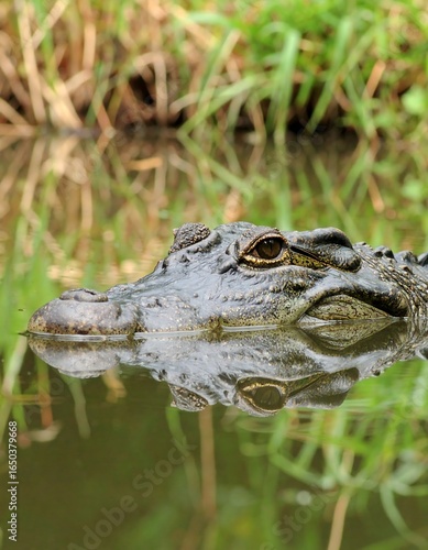 © Can, Obraz premium A crocodile's head and reflection in calm water, surrounded by green vegetation