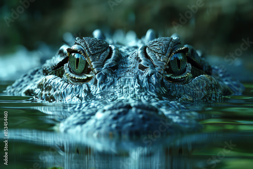 © Phichitpon, Obraz premium a crocodile's head emerging from tranquil waters. ai generative