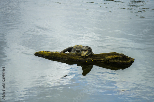 Obraz premium A crocodile sitting perched on a branch floating in the waters of a river...