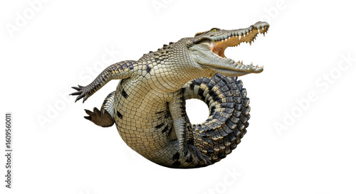 © SteffCunha, Obraz premium A crocodile with its mouth open and its tail curled up on a black background in a studio shot