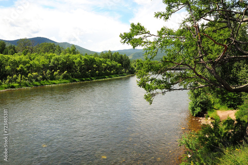 © Алексей Желтухин, Fototapeta premium A crooked branch of a large pine leans on the bed of a beautiful river flowing through the mountain taiga.
