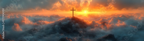© Creative_Bringer, Obraz premium A cross atop a misty mountain, with sun rays piercing through clouds, creating a heavenly atmosphere