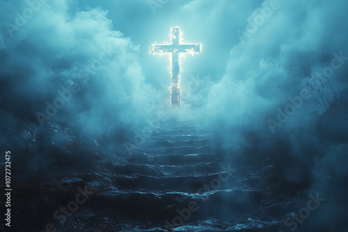 Naklejka premium A cross in the sky, shining brightly, surrounded by clouds with stairs...