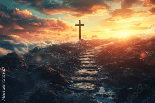 © Phuriphat, Naklejka premium A cross is standing on a rocky mountain path