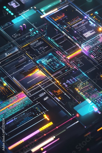 © Starlight, Obraz premium A cross-platform integration concept featuring synchronized business applications and data. The scene includes a central control panel managing interactions between different software platforms, Gener