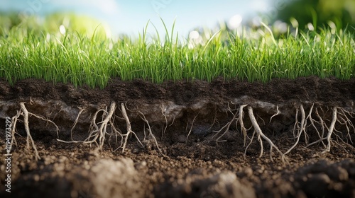 Fototapeta premium A cross-sectional view of grass roots with intricate soil textures, focusing...