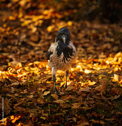 © Levon, Naklejka premium A crow bird is standing on a pile of leaves