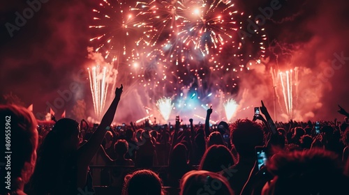 Fototapeta premium A crowd of people are watching fireworks in the sky party vibing