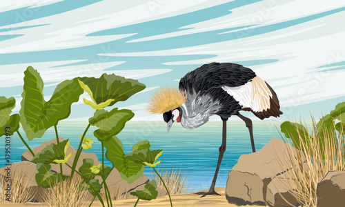 © AnnstasAg, Obraz premium A crowned crane walks along a sandy seashore with tropical plants. Wild bird of Africa. Realistic vector animal.