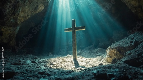 Naklejka premium A crucifix stands alone within a cave, bathed in divine light.