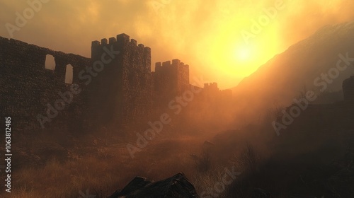 Fototapeta premium A crumbling stone castle wall stands silhouetted against a fiery orange sunset, with mist swirling around it, creating a sense of mystery and history.