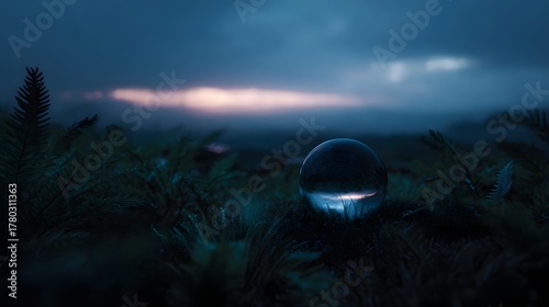© Bussakon, Fototapeta premium A crystal ball rests in lush green grass at dusk reflecting the serene atmospheric twilight horizon