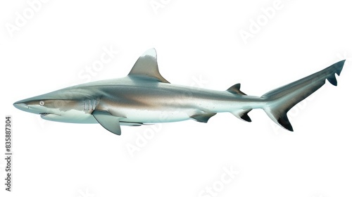 © 69, Obraz premium A crystal-clear image of a reef shark, with its smooth skin and elegant movement, set against a pure white background