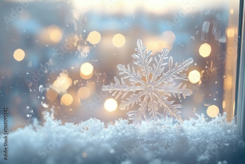 Naklejka premium A crystalline snowflake rests on a snowy windowsill, illuminated by warm,...