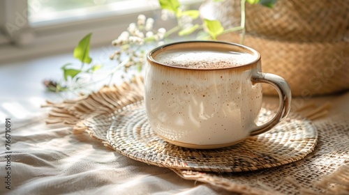 Fototapeta premium A cup of coffee on a table next to some plants, AI