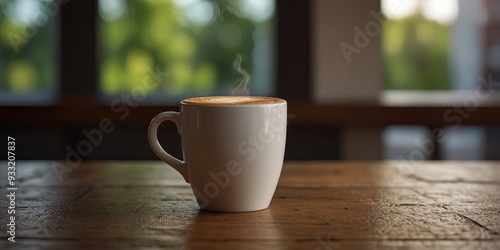 © DEER FLUFFY, Fototapeta premium A cup of coffee sitting on top a wooden table.