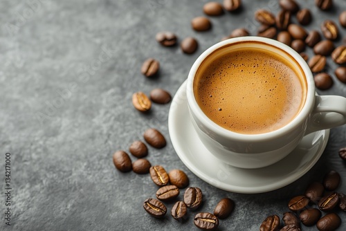 Fototapeta premium A cup of hot espresso and coffee beans on a grey background