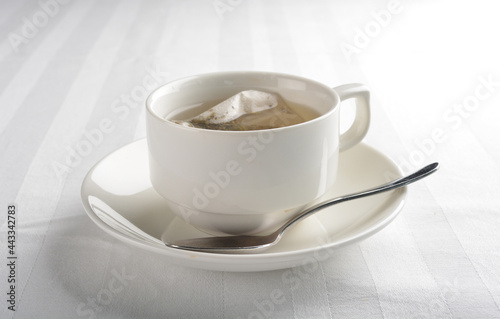 Fototapeta premium a cup of hot green tea leaf in bag on white background halal beverage menu