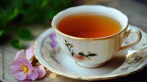 © Ксения Омельченко, Fototapeta premium A cup of tea on a wooden table by a window, with steam rising.