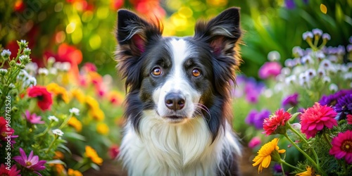 © Curie, Fototapeta premium "A curious Border Collie with a fluffy coat and piercing brown eyes stands proudly amidst a garden of vibrant flowers and lush greenery."