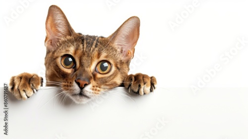 Obraz premium A curious cat is peeking over a white surface, its front paws and head...