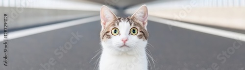 © nattapon98, Obraz premium A curious cat sits in the middle of a road, looking surprised with wide eyes, framed by a blurred background of asphalt.