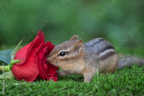 © Lee, Obraz premium A curious chipmunk stops to smell a red rose in garden
