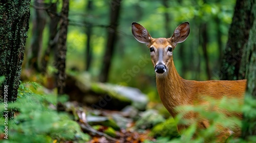 © RANO AKTER SANTA, Fototapeta premium A curious deer with large ears gazes forward in a lush green forest setting