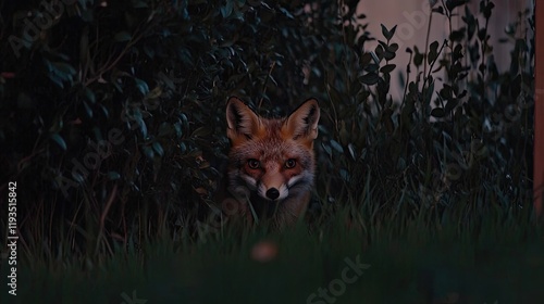 Obraz premium A curious fox peeking through backyard shrubs during twilight, blending into...