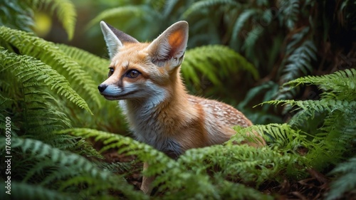 Obraz premium A curious fox peering through lush green ferns in a serene forest...