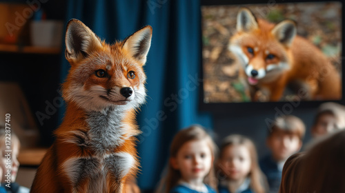 Naklejka premium A curious fox watches a screen with children, creating a whimsical and...