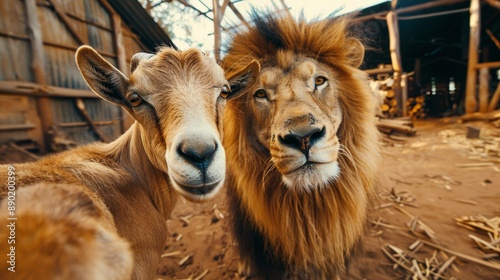 Naklejka premium A curious goat and a majestic lion share a close-up selfie