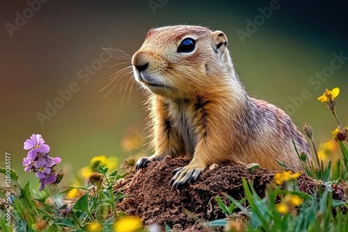 © Djokers, Fototapeta premium A curious ground squirrel perched on a mound, surrounded by colorful flowers.