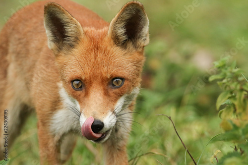 Fototapeta premium A curious hunting Red Fox (Vulpes vulpes) with its tongue sticking out licking its nose.