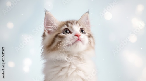 Fototapeta premium A curious kitten looking up with wide eyes, soft fur and delicate features, light bokeh background, serene and dreamy atmosphere, and indoor portrait.