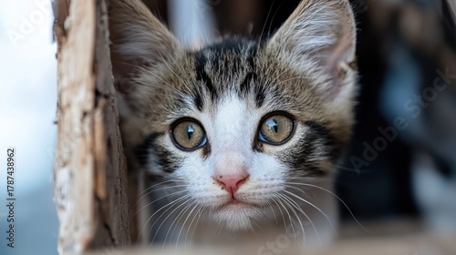 Fototapeta premium A curious kitten peering out from behind a wooden structure.