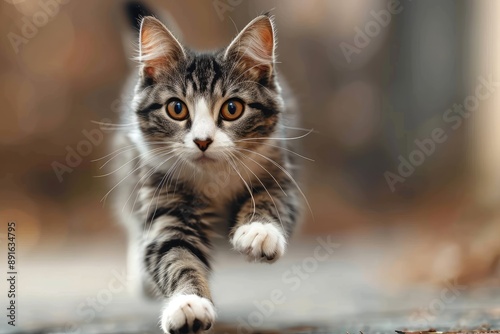 © NikahGeh, Naklejka premium A Curious Kitten With Striking Yellow Eyes Gazes Directly at the Camera While Running Towards the Vi