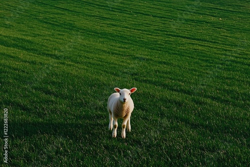 © Adi, Obraz premium A curious lamb stands alone in a lush green pasture under a clear blue sky, symbolizing tranquility