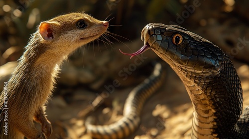 Fototapeta premium A Curious Mongoose Encounters a Venomous Black Snake