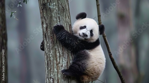 © Ahmad-Muslimin, Fototapeta premium A Curious Panda Cub Climbing a Tree in the Forest