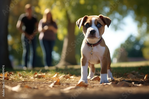 © Sebastian, Obraz premium A curious puppy meeting new human and animal friends at the park. Concept of socialization. Generative Ai.