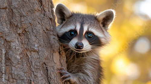 Fototapeta premium A curious raccoon peeks from behind a tree, surrounded by autumn foliage and soft sunlight