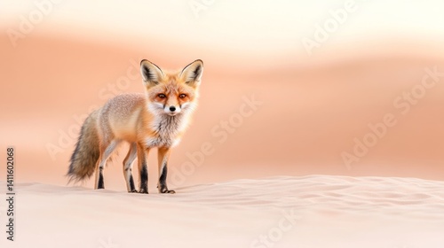 Obraz premium A curious red fox explores the vast sandy desert, its coat glowing softly in...