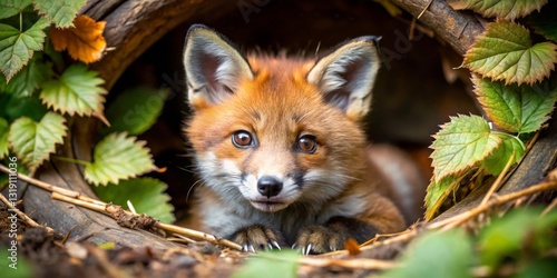 Fototapeta premium A Curious Red Fox Kit Peeking from its Woodland Burrow, Framed by Autumnal Foliage
