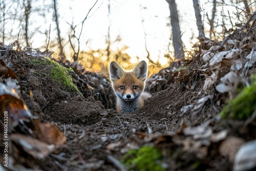 © imagepocket, Fototapeta premium A curious red fox kit peeks from its den in a sunlit forest.